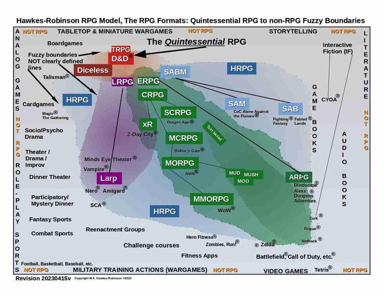 W.A. Hawkes-Robinson has proposed a model for RPGs which delineates four distinct RPG formats: Quintessential RPG, Live-Action Role-Playing Game (LARP), Electronic Role-Playing Game (ERPG), and Hybrid RPG (HRPG).